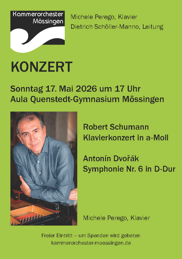 Das Kammerorchester Mössingen musiziert nach langer Auftrittspause wieder vor Publikum am Sonntag, den 26. März 2023, um 19:00 Uhr in der Aula des Quenstedt-Gymnasiums Mössingen unter der engagierten Leitung von Dietrich Schöller-Manno.